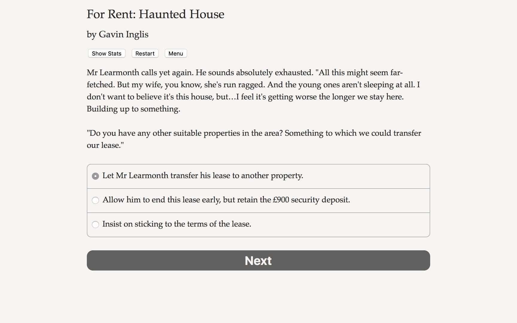 Vos choix déterminent le déroulement de l'histoire. Par exemple, lorsque vos locataires, qui n'ont pas fermé l'œil depuis des jours à cause de chuchotements glaçants provenant des murs, demandent à résilier leur bail, que faites-vous ?